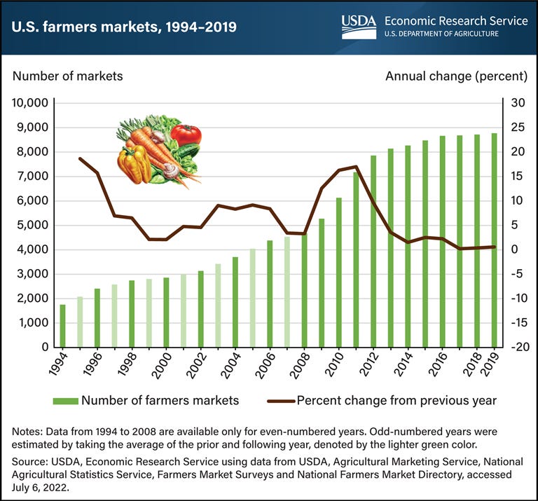 I will also note here that academic reviewers, one of grants and another who focuses on peer-reviewed articles, have both suggested to me directly that farmers markets are “declining” because the number of markets is not rising as quickly as it had in previous decades. I cannot suppress an eye roll at the memory of those emails.